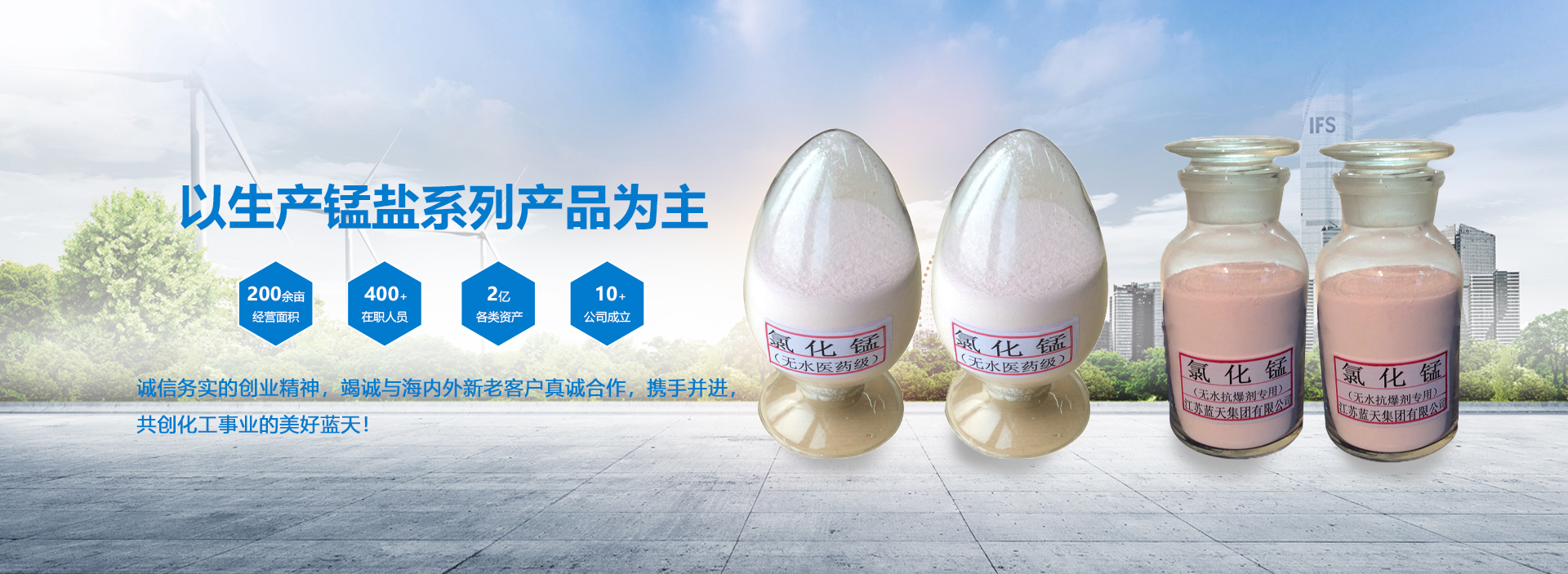 淮安市藍天化工有限公司,是以生產錳鹽等無機鹽系列產品為主。農藥中間體、醫藥中間體加工、新產品研發為一體的大型綜合性民營企業。公司業務遍及海內外數十個城市與地區,現擁有各類資產2億多元,生產經營面積200余畝,員工400多人。其中各類專業技術人員占1/3以上。并具有較強的技術研發和生產能力。現已初步形成一支高素質、敬業愛崗、廉潔高效的作戰團隊。